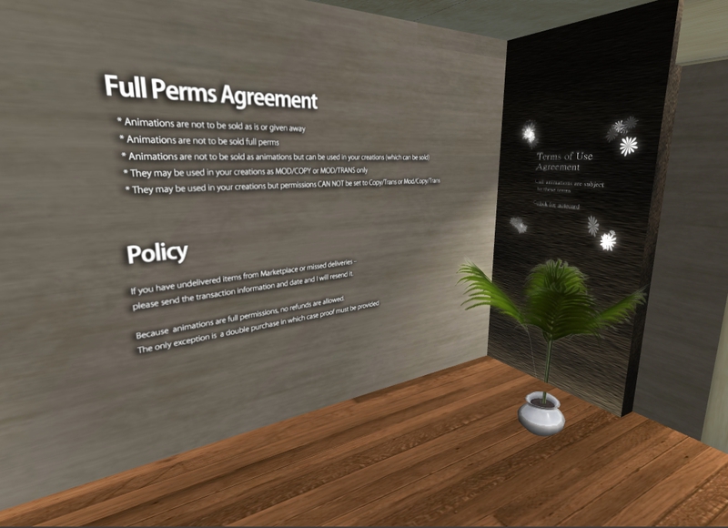 You can buy packs of full perm animations for share with your contacts or for be included in your creations. Animations are based in everyday tasks, like sitting, cooking, sleeping, taking a shower and others. They sell couple poses and animations for partner actions and romance, and animations and poses for ...
